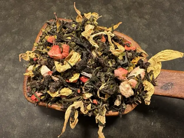 Ingredients: Rooibos, strawberries, rhubarb, pink rosebuds, black darjeeling tea, heather flowers, rose pepper and aromas.